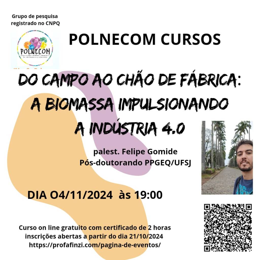 Em 04 de Novembro de 2024 às 19 horas, on line, teremos o pós doutorando em Engenharia Química que trabalha com empreendedorismo de base tecnologia, bioprocessos e materiais ligninocelulosicos, Felipe . As inscrições serão abertas no dia 21 de outubro e podem ser acessadas no Qrcode da imagem ou pelo site https://profafinzi.com/pagina-de-eventos/ . O curso é gratuito, tem duração de duas horas e emissão de certificado.