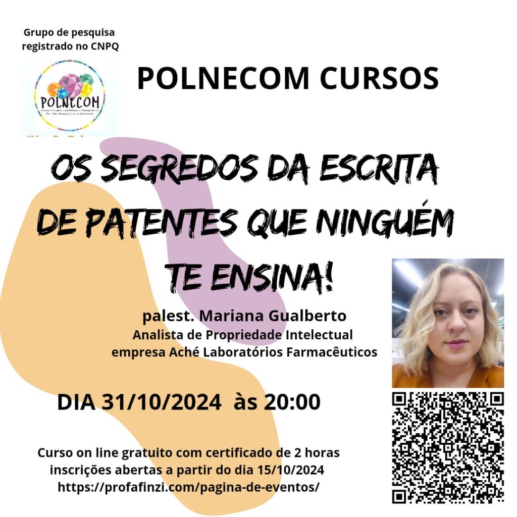 Em 31 de Outubro de 2024 às 20 horas, on line, teremos a Analista de Propriedade Intelectual na empresa André Laboratórios Farmacêuticos, Mariana Gualberto,. As inscrições serão abertas no dia 15 de outubro e podem ser acessadas no Qrcode da imagem ou pelo site https://profafinzi.com/pagina-de-eventos/ . O curso é gratuito, tem duração de duas horas e emissão de certificado.